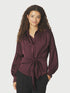Vrouwelijk shirt met plooidetails op de mouw en een knoopdetail aan de voorkant, waardoor het shirt en de taille verstelbaar zijn en strakker of losser kunnen worden gemaakt. De stof is zacht en luxueus satijn. Het shirt heeft knoopjes aan de voorkant.