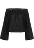 De Inan Lace Top - Raven van Dante 6 straalt pure elegantie uit. De luxueuze plissé kanten stof geeft de top een verfijnde textuur, terwijl de off-shoulder pasvorm zorgt voor een subtiel verleidelijke uitstraling.
