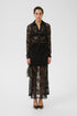 Kanten blouse met klassieke kraag en knoopsluiting aan de voorkant. De blouse is transparant en heeft plooidetails die de structuur van het materiaal benadrukken. Het model is 175 cm lang en draagt maat S/36.