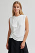 De Missouri Top in wit van Second Female is een stijlvolle en vrouwelijke sleeveless tee met een moderne twist. Gemaakt van een zachte, stretchy lyocell-katoenmix voor ultiem comfort. De geplooide details aan de voorkant creëren een elegant gedrapeerd effect, terwijl de diep uitgesneden armsgaten zorgen voor een eigentijdse look. De relaxed fit aan de bovenkant in combinatie met een meer aangesloten taille geeft een flatterend silhouet. Perfect voor zowel casual als geklede outfits.