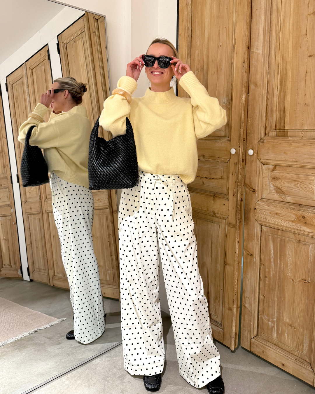 Afgelopen winter zagen we veel gebreide puntsjaals. Maar dit voorjaar? Stippen. Overal. Polka dots nemen het straatbeeld over. Wil je het subtiel houden? Ga voor een satin scarf met print.