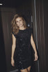 Deze glanzende jurk heeft een aangesloten pasvorm en brede schouders, en valt elegant tot halverwege de dij. Met korte mouwen en een klassieke ronde halslijn is het de perfecte keuze voor feestelijke gelegenheden of een avondje uit.